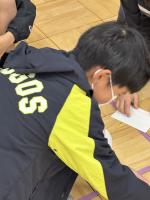 チームで工夫したペーパータワーの上に、本校にキャラクター「サイのすけ」が乗ります。