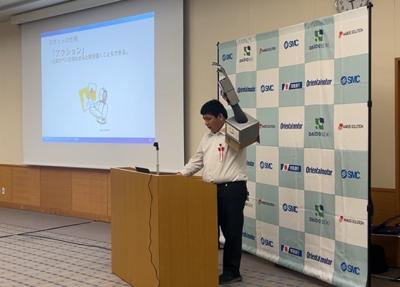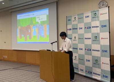『山の守り神ロボット』についての発表では、森林管理の現状や害獣による被害額について実例を基に説明し、ロボットによる森林保護の可能性について提案しました。